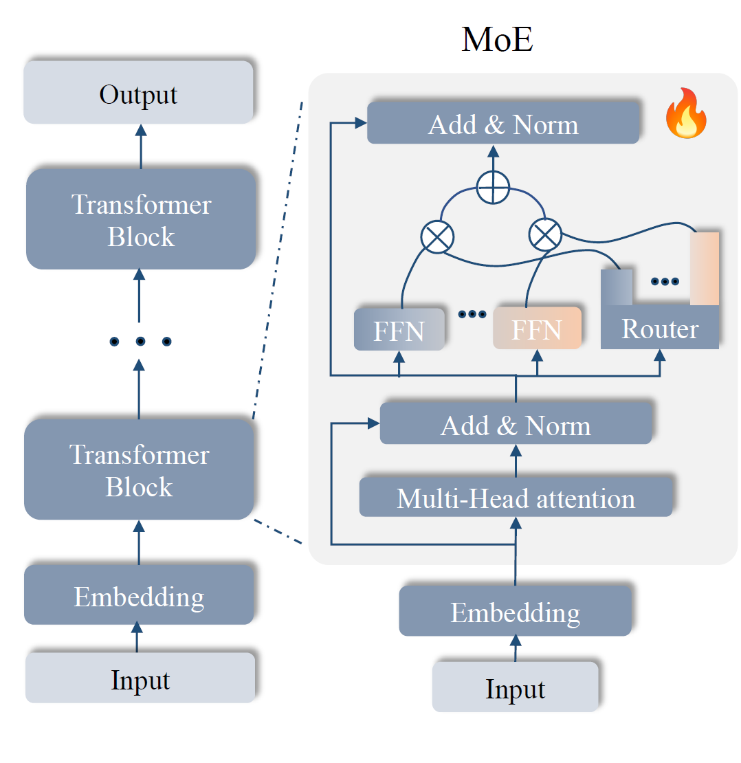 - 普通 Transformer 的 FFN 被换成 LoRA + MoE 专家网络。